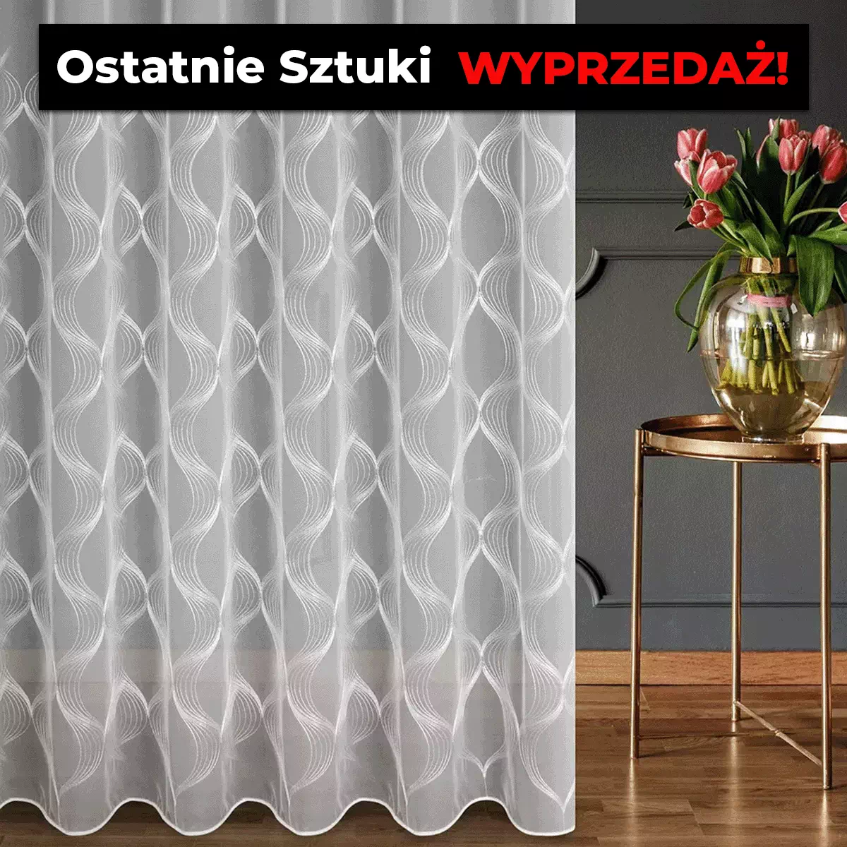 Firana "Anastazja" to doskonały wybór dla tych, którzy poszukują eleganckiej, długiej firany do salonu. Wykonana z lekkiej, śnieżnobiałej matowej mikrosiateczki, wprowadza do wnętrza subtelną świeżość i elegancję. Dolna część tkaniny jest ozdobiona szerokim pasem geometrycznego haftu, który tworzy efektowny, falujący wzór, nadając pomieszczeniu unikalny charakter.