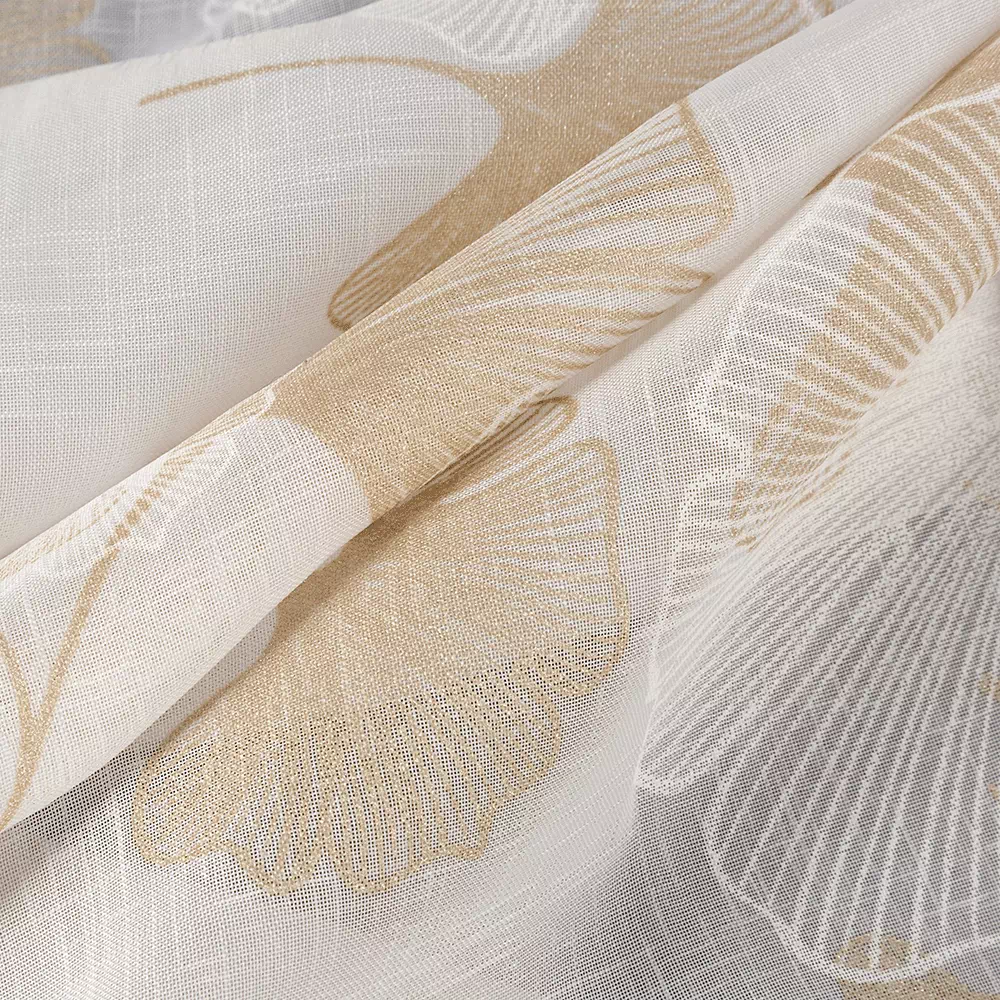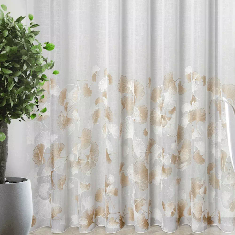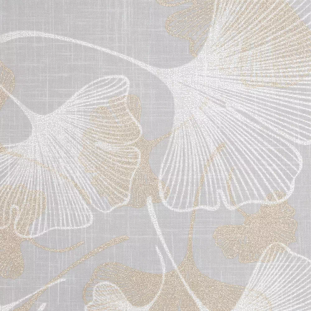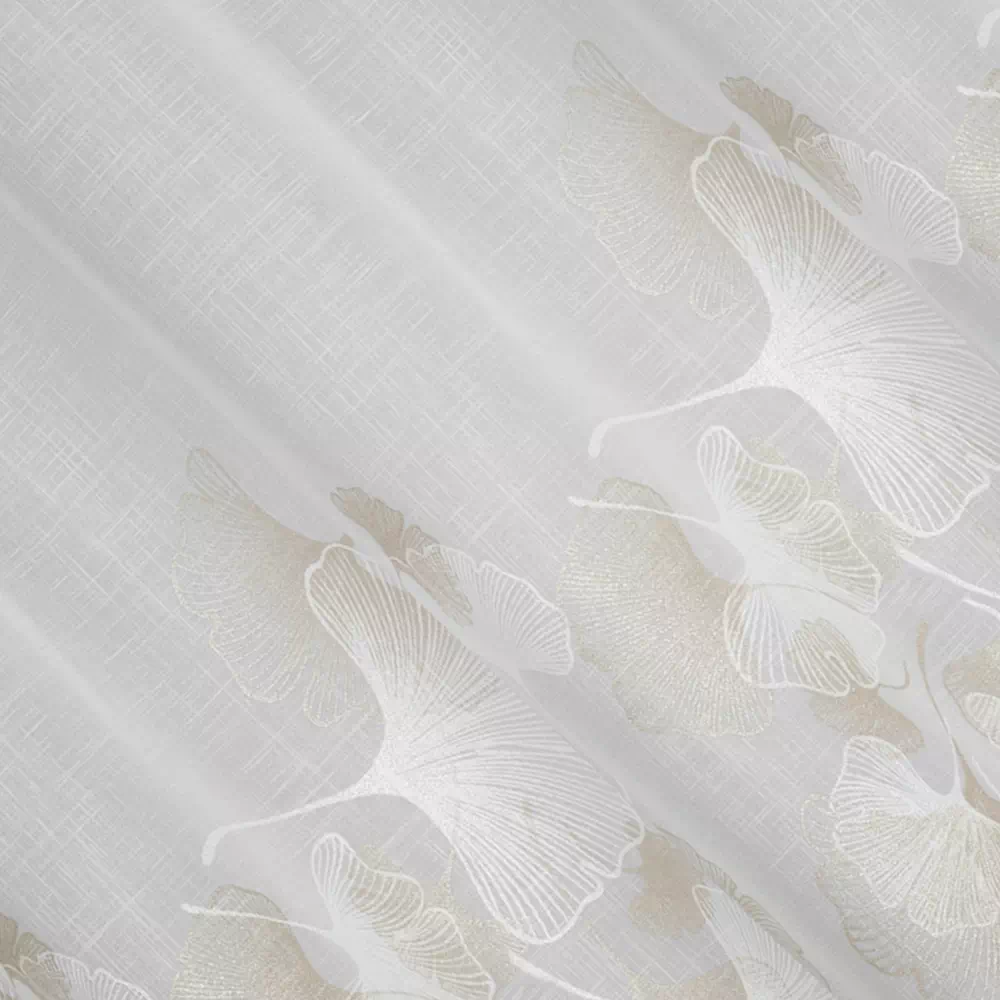 ✨ Odkryj luksus w każdym szczególe z naszą wysokiej klasy firanką w bieli, której subtelny blask jasnego złota dodaje wnętrzu wyrafinowanego charakteru. Prezentujemy elegancką firanę, której nowoczesny wzór miłorzębu wplata naturę w miejską przestrzeń, tworząc spokojną i stylową atmosferę w Twoim domu.
