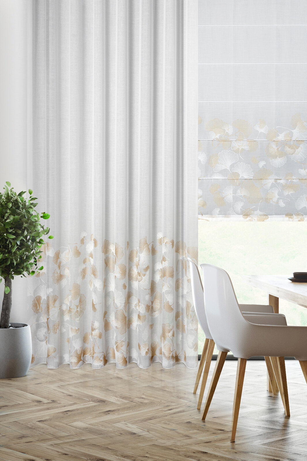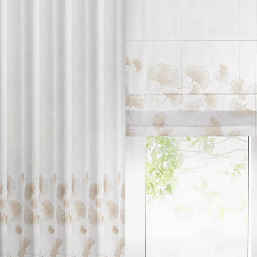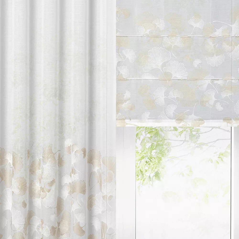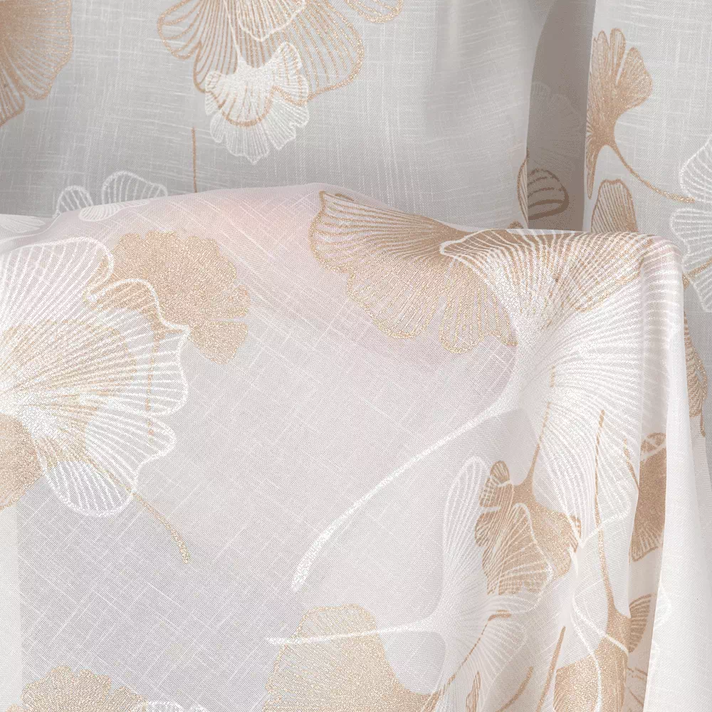 ✨ Odkryj luksus w każdym szczególe z naszą wysokiej klasy firanką w bieli, której subtelny blask jasnego złota dodaje wnętrzu wyrafinowanego charakteru. Prezentujemy elegancką firanę, której nowoczesny wzór miłorzębu wplata naturę w miejską przestrzeń, tworząc spokojną i stylową atmosferę w Twoim domu.