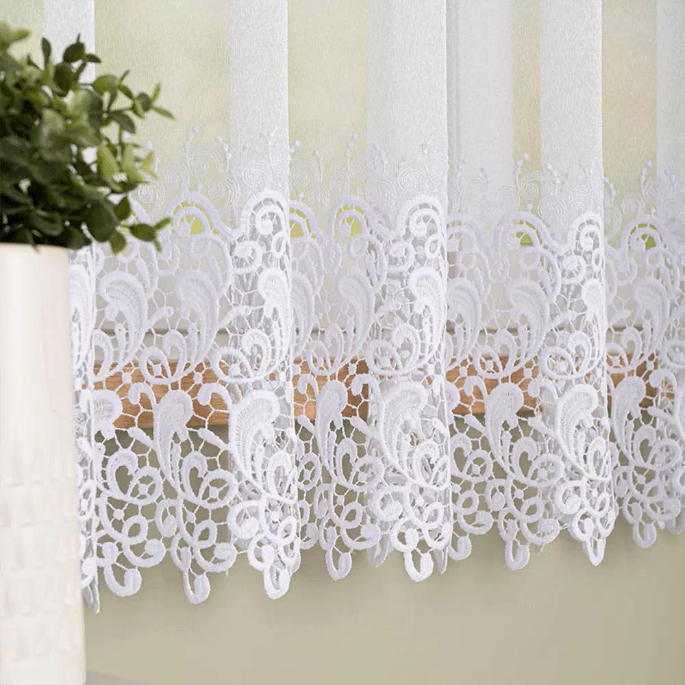 Firana „Bożena” to elegancka propozycja z delikatnej markizety ozdobionej DWOMA pasami gipiury. Ażurowy wzór z subtelnymi motywami roślinnymi pięknie rozprasza światło i nadaje wnętrzu lekkości – idealnie do salonu, sypialni czy kuchni. Szyjemy NA WYMIAR w naszej polskiej szwalni Radimar.
