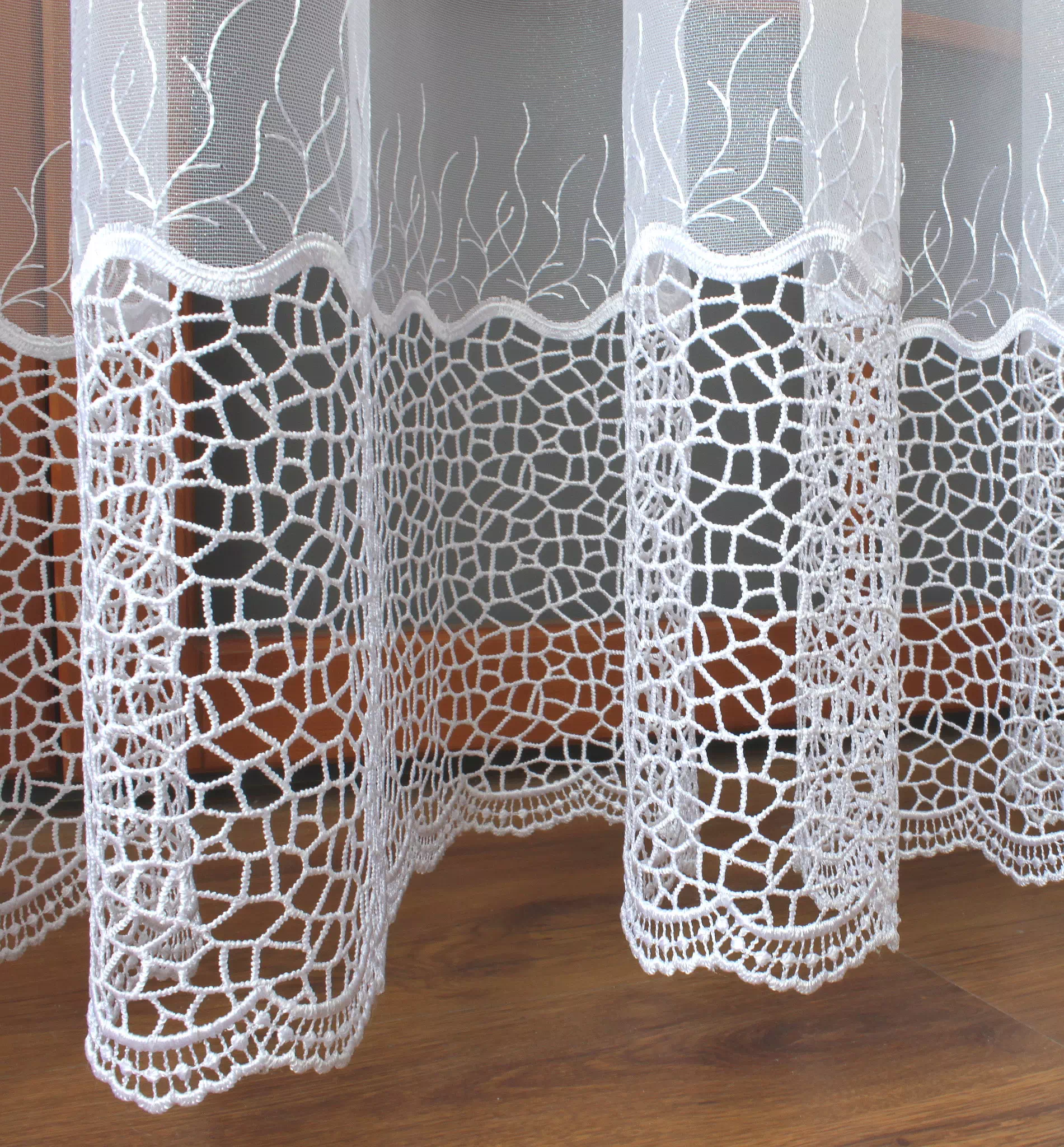 Firanka Ola charakteryzuje się delikatnym wzorem gipiurowym oraz wysoką jakością materiału. Doda domowi niepowtarzalnego uroku oraz stworzy przytulną atmosferę. Jedno pasowy wzór z gipiury w połączeniu z efektowną markizetą nabłyszczaną tworzą wysoko gatunkową a zarazem uroczą firankę do wnętrza.