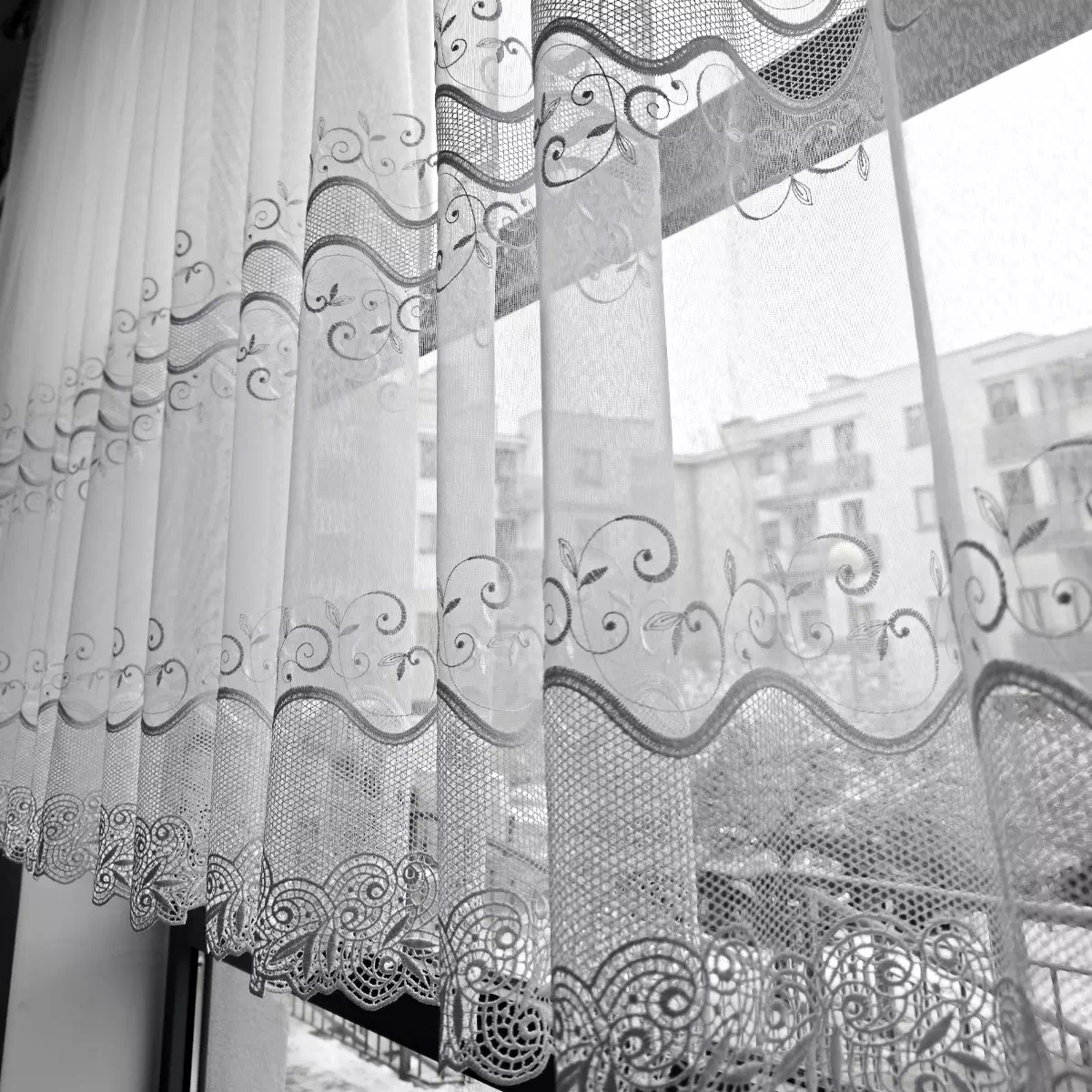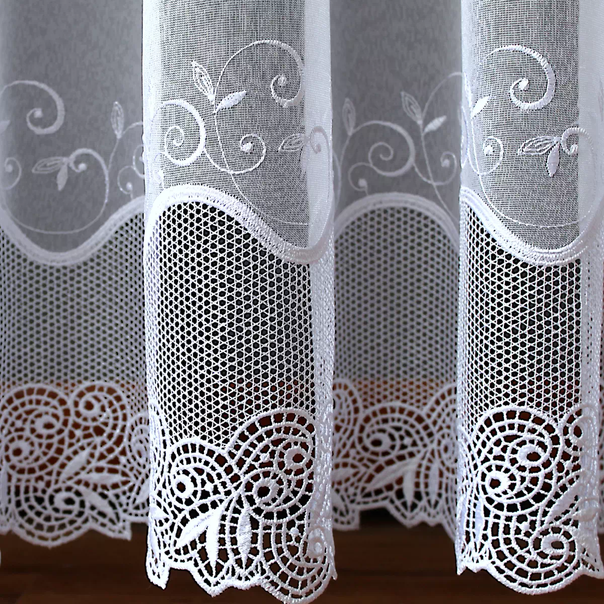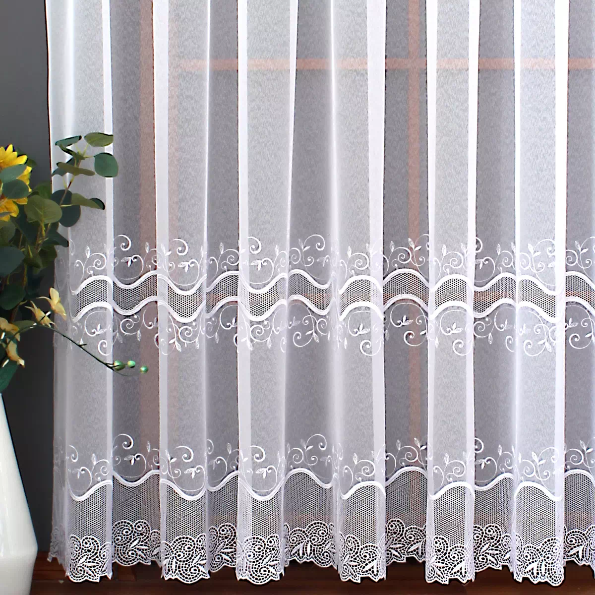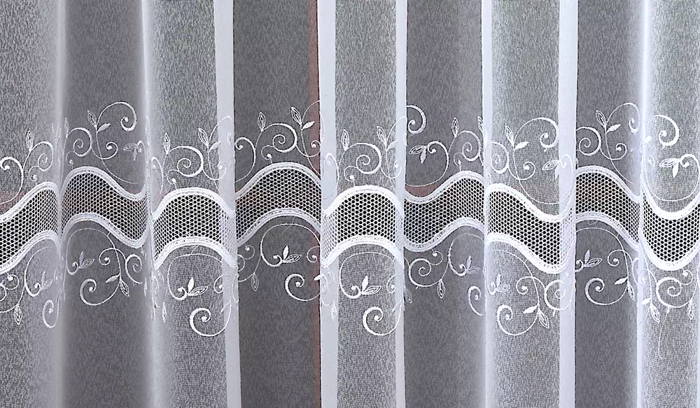 Wzór gipiury to subtelne ornamenty roślinne z pięknym, wyraźnym haftem. W przeciwieństwie do ciężkich wzorów, gipiura w modelu Natalia jest delikatna, co sprawia, że firana nie przytłacza pomieszczenia, lecz wpuszcza do niego dużo naturalnego światła.