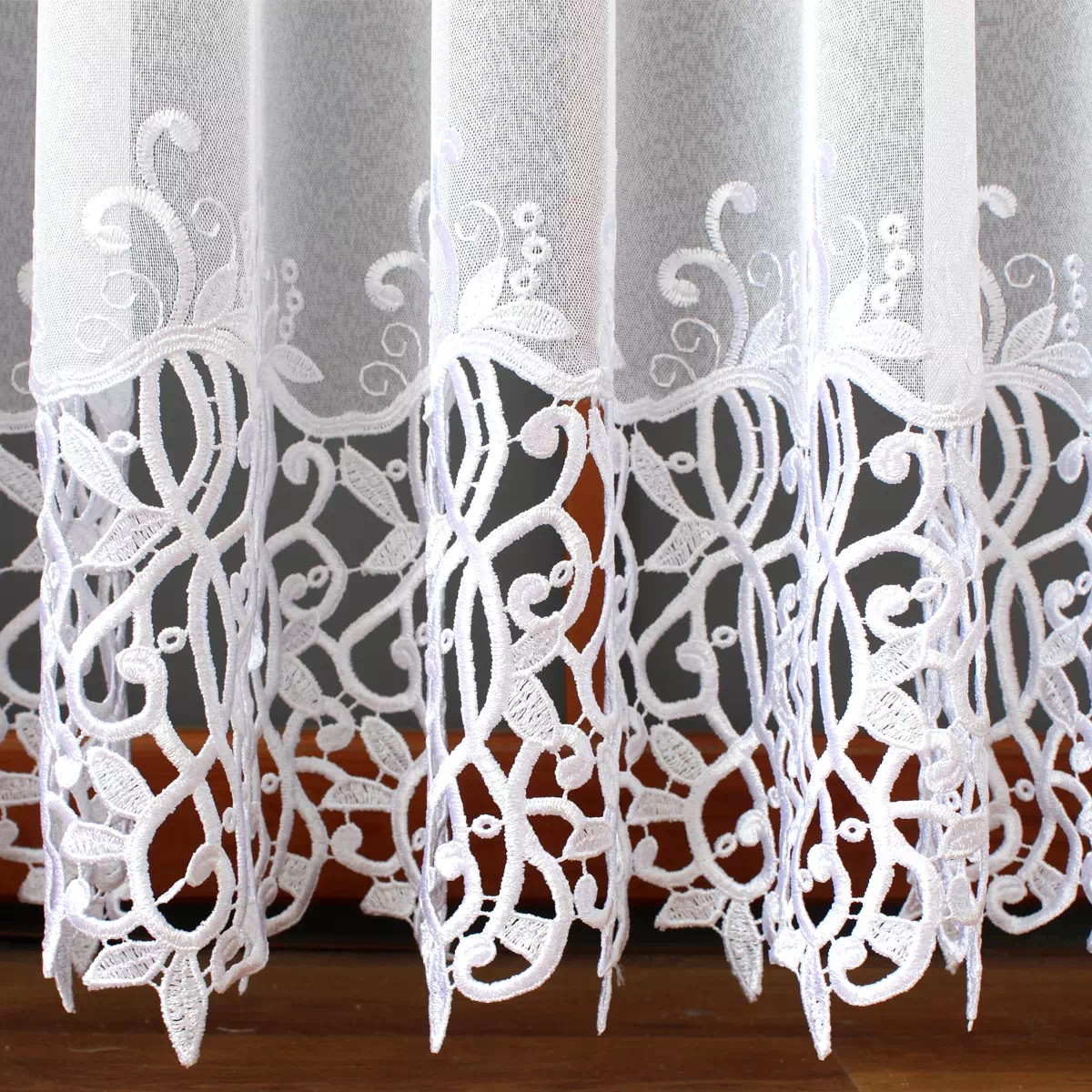 Firana szyta na wymiar aplikacja gipiurowa "Listki" szyta przez doświadczone krawcowe w szwalni Radimar Stargard. Firana ta posiada dwa pasy gipiurowe w kolorze białym. Firanki gipiurowe to elegancki i stylowy sposób na ozdobienie okien. Gipiury, czyli dekoracyjne wykończenia tkanin, nadają im subtelny charakter i dodają uroku pomieszczeniu. Wśród różnorodnych rodzajów firanek, te gipiurowe zasługują na szczególną uwagę ze względu na swoją wyjątkową fakturę i delikatność.