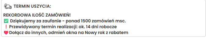 Informacje przesyłane drogą mailową dotyczące statusu realizacji zamówienia i przewidywanego terminu realizacji mają charakter bardziej aktualny niż ogólny komunikat widoczny na karcie produktu i służą bieżącemu informowaniu Kupującego o postępie realizacji zamówienia.